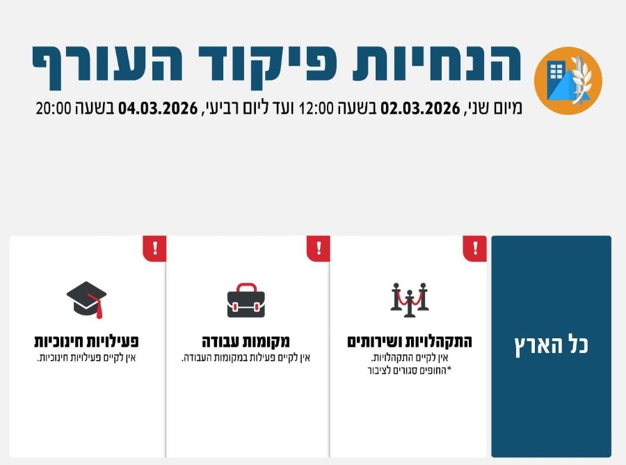יש להמשיך ולעקוב אחר ההנחיות שמפרסם פיקוד העורף באמצעי ההפצה הרשמיים.