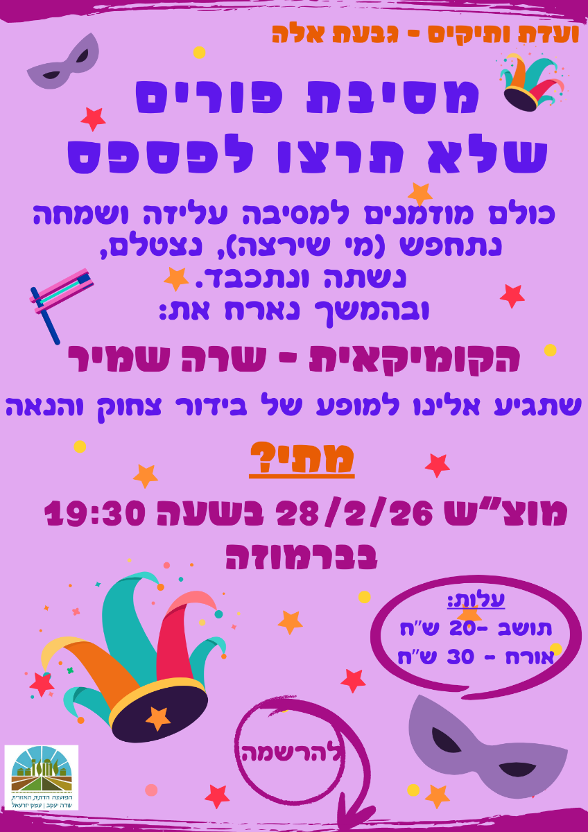 מסיבת פורים - עם הסטנדאפיסטית שרה שמיר - בחסות ועדת ותיקים - כולם מוזמנים! מוצ"ש 28.2 ב- 19:30 בברמוזה